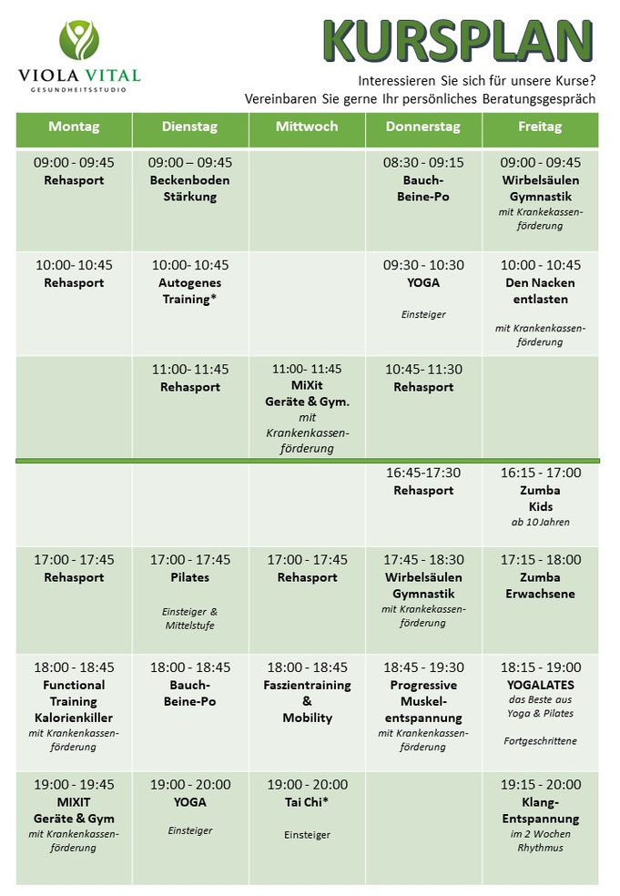 Die Auswahl reicht von Gesundheitskursen und Kräftigungskursen für die Rückenmuskulatur, über Figur-Training, bis hin zu Entspannungskursen.